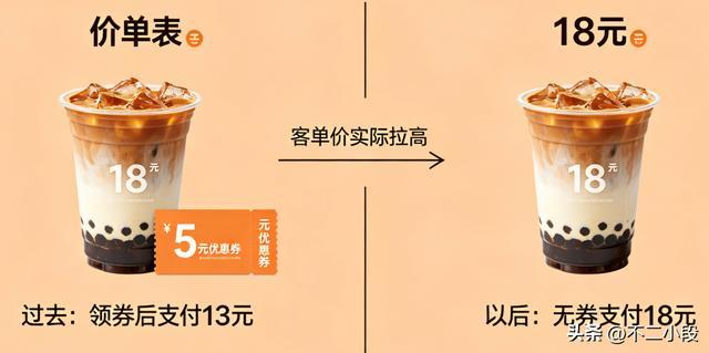 价目表上那杯奶茶虽然还是标着十八块钱,但过去你动动手指就能领到一张五元的优惠券,花十三块钱就能喝到,而以后,这种优惠券的发放频率会大幅度降低,甚至彻底消失。你实际支付的客单价,在不知不觉中就被拉高了。