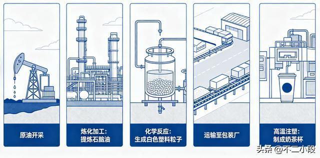 原油从地下开采出来,经过大型炼化工厂的加工,提炼出石脑油,再进一步发生化学反应,变成白色的塑料粒子,最后送进包装厂的流水线,在高温下注塑成型,变成你手里那个精致的奶茶杯。